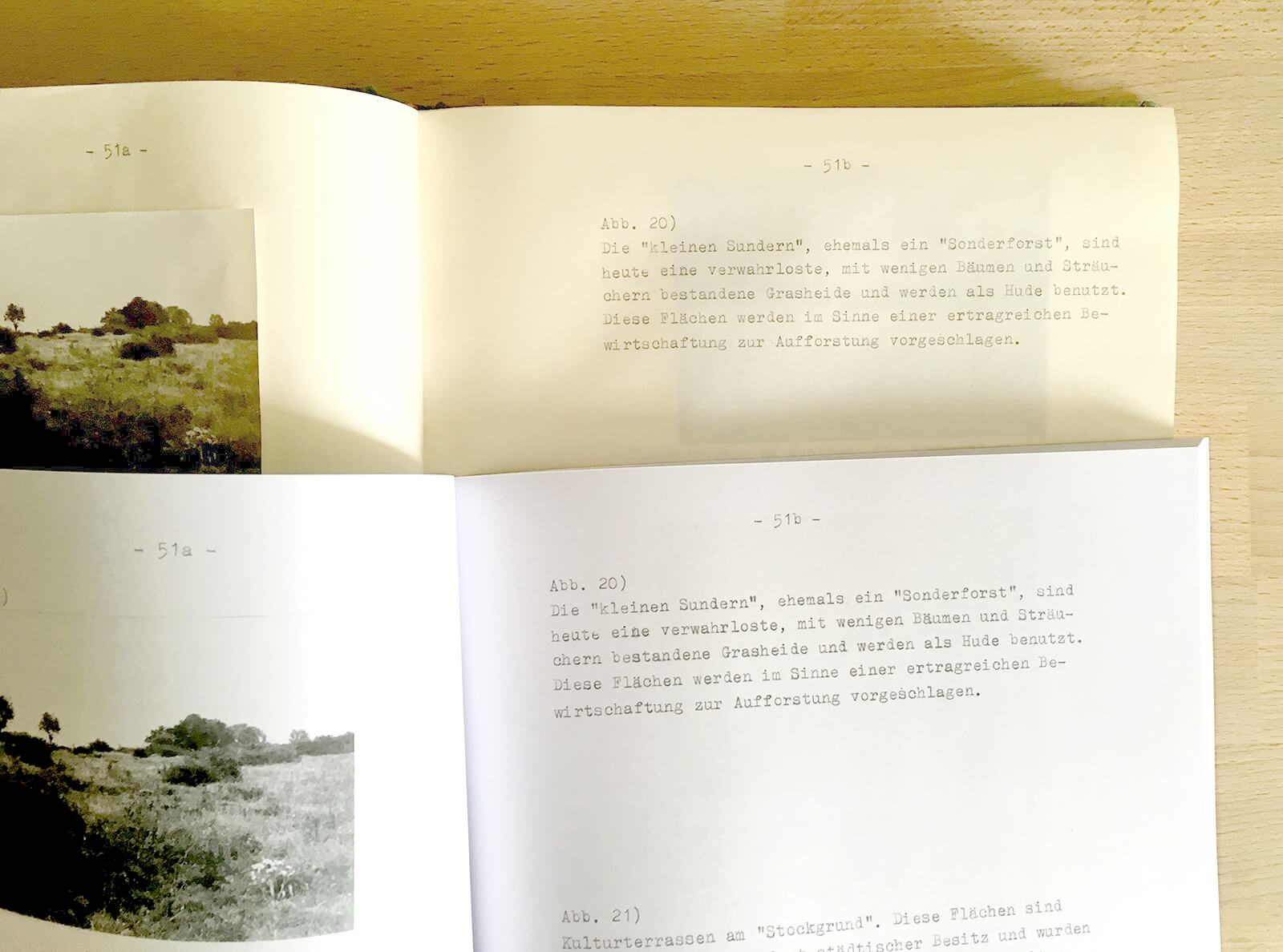 Oben das Original mit eingeklebten Fotos und handkolorierten Abbildungen, darunter der Nachdruck.