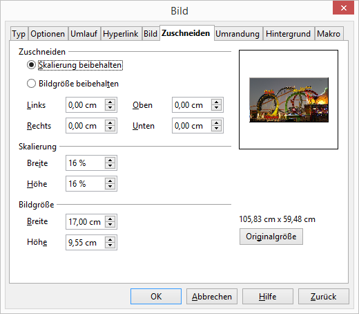 Das Zuschneiden-Register ändert den sichtbaren Bildbereich, wovon Sie aber keinen Gebrauch machen sollten. Sie »schleppen« in der Open Office-Datei dann nämlich weiterhin die vollständige Bilddatei mit. Empfehlenswerter erscheint es uns, stattdessen nur fertig beschnittene Bilder ins Dokument einzufügen.