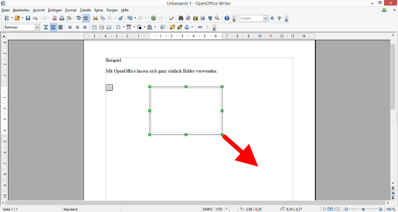 Die Position des Rahmens und dessen Größe ändern Sie genauso, wie wir es im Zusammenhang mit den Bildern beschrieben haben: Klicken Sie den Rahmen an und ziehen Sie mit gedrückter linker Maustaste an den grünen Knöpfen. Mit gedrückter linker Maustaste verschieben Sie den Rahmen.