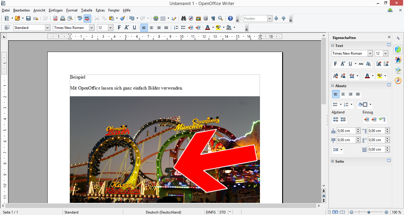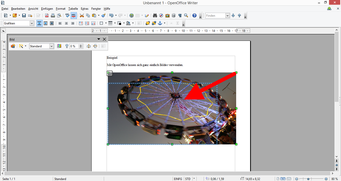 Die eingefügten Fotos lassen sich mit der Maus (linke Maustaste dabei gedrückt halten) bequem auf der Seite verschieben. Wenn Sie allerdings ein Foto von einer Seite auf eine andere verschieben möchten, wird es leider mühselig. In diesem Fall markieren Sie das Foto mit einem Klick und betätigen Strg + X, was das Foto in die Zwischenablage verschiebt. Gehen Sie nun auf eine andere Seite im Dokument und betätigen Sie Strg + V oder Strg + Einf. Open Office fügt das Bild von der Zwischenablage an die Cursorposition ein.