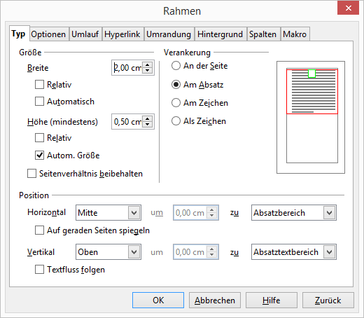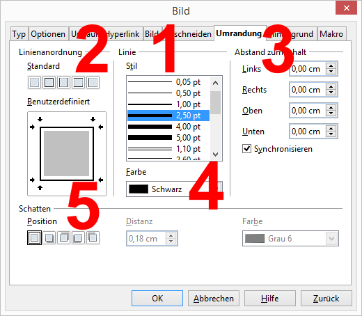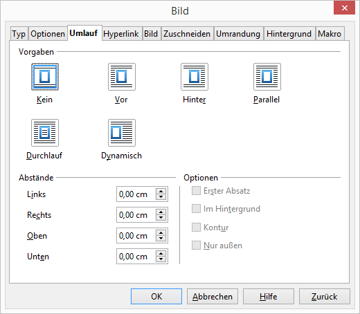 Die Bild-Optionen verteilen sich über mehrere Register, zwischen denen Sie am oberen Rand umschalten. Wichtig für Sie sind davon die (hier mit einem X markierten) Register Typ, Umlauf, Zuschneiden und Umrandung.