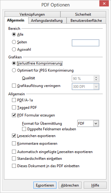 Unter Grafiken-Einstellungen: Falls Sie die PDF-Datei in höchster Qualität drucken möchten, wählen Sie Verlustfreie Komprimierung. Für die Weitergabe per E-Mail oder das Hochladen in Webseiten empfiehlt es sich Optimiert für JPEG-Komprimierung zu aktivieren. Anschließend stellen Sie die Qualität ein, wobei wir Werte über 90 empfehlen. Die PDF-Dateigröße schrumpft dadurch erheblich Zu den Qualitätsstufen siehe auch Kapitel Fehler: Referenz nicht gefunden Fehler: Referenz nicht gefunden. Mit Vorsicht sollten Sie Grafikauflösung verringern anwenden, denn gering aufgelöste Bilder werden dadurch mitunter sehr pixelig.