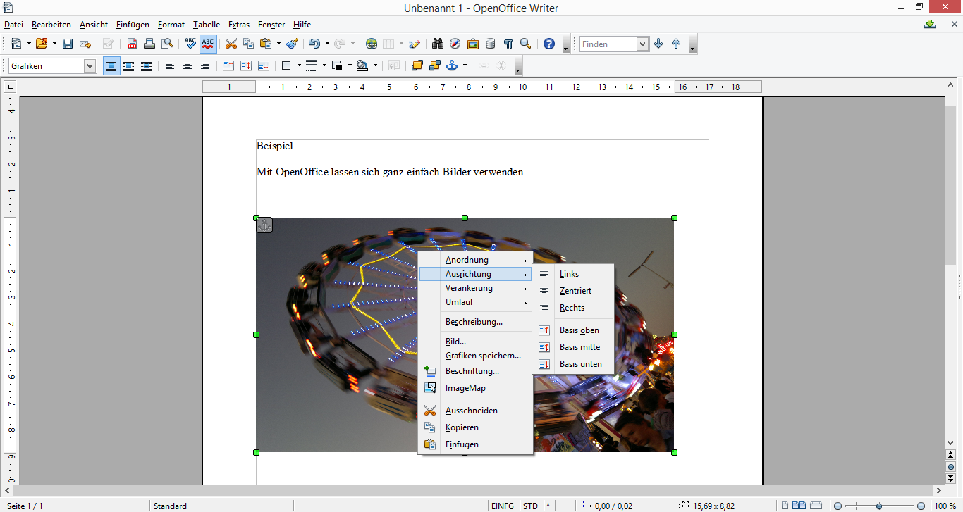 Die rechte Maustaste öffnet über einem Bild das Popup. Interessant ist darin vor allem das Ausrichtung-Menü, mit dem Sie das Foto an den linken oder rechten Rand oder in der Zeilenmitte ausrichten. Über Umlauf stehen zudem die bereits oben beschrieben Funktionen zum Textdurchlauf zur Verfügung.
