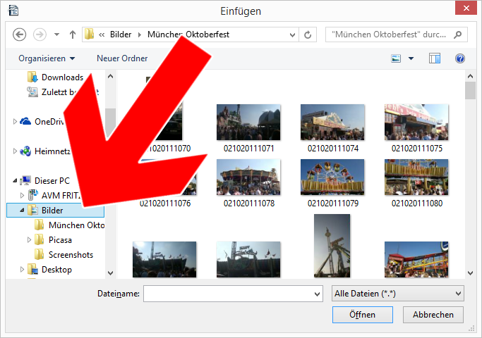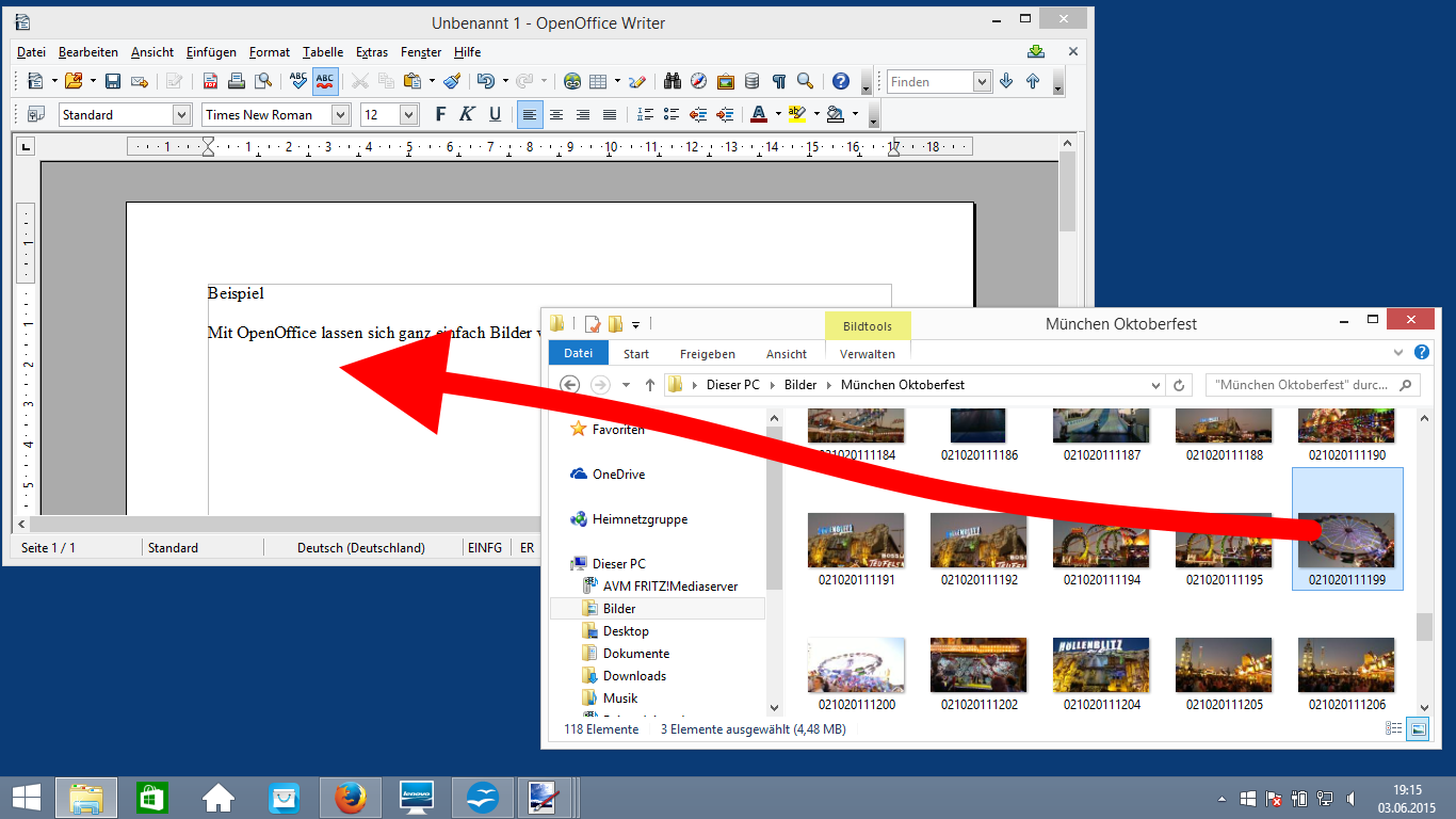 Mehrere Bilder auf einmal fügen Sie am einfachsten ein, indem Sie sie im Bilderverzeichnis zuerst markieren (mit der Maus und gedrückter linker Maustaste einen Rahmen um die Dateien ziehen oder Strg-Taste gedrückt halten und Bilder einmal anklicken) und dann in die Textverarbeitung ziehen.