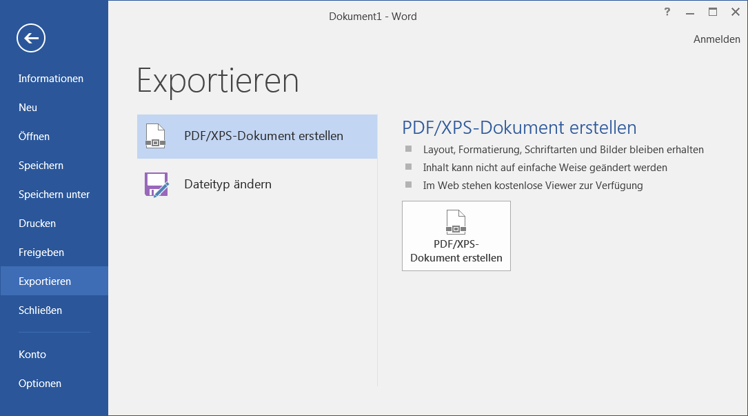 Trotzdem empfehlen wir Ihnen, die PDF-Umwandlung selbst durchzuführen, denn Microsoft hat inzwischen seine Office-Produkte mit einem PDF-Generator ausgestattet, den Sie unter Datei/Exportieren in der Menüleiste erreichen.