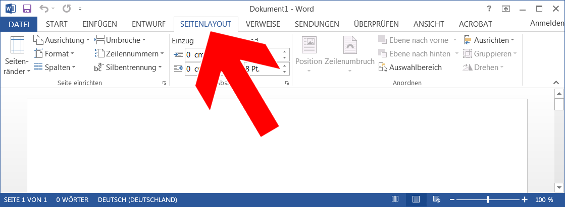 Bei MS Word aktivieren Sie einfach das SEITENLAYOUT-Register (Pfeil) und nehmen die Einstellungen vor.