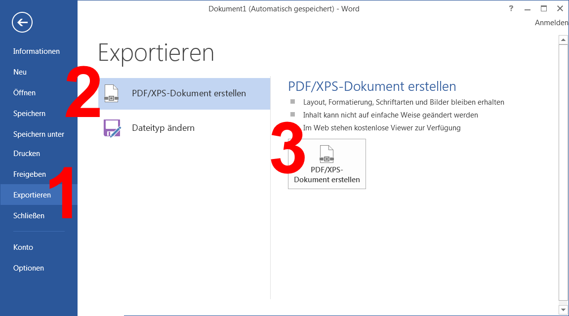 erstellen und gehen dann auf PDF/XPS-Dokument erstellen.