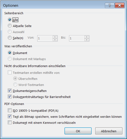 Nicht druckbare Informationen einschließen: Word bettet zusätzliche Daten, die Sie in den Dokumenteigeschaften eingegeben haben, in der PDF ein. Dadurch lässt ich unter Umständen der Autor identifizieren. Deaktivieren Sie deshalb gegebenenfalls Dokumenteigenschaften.