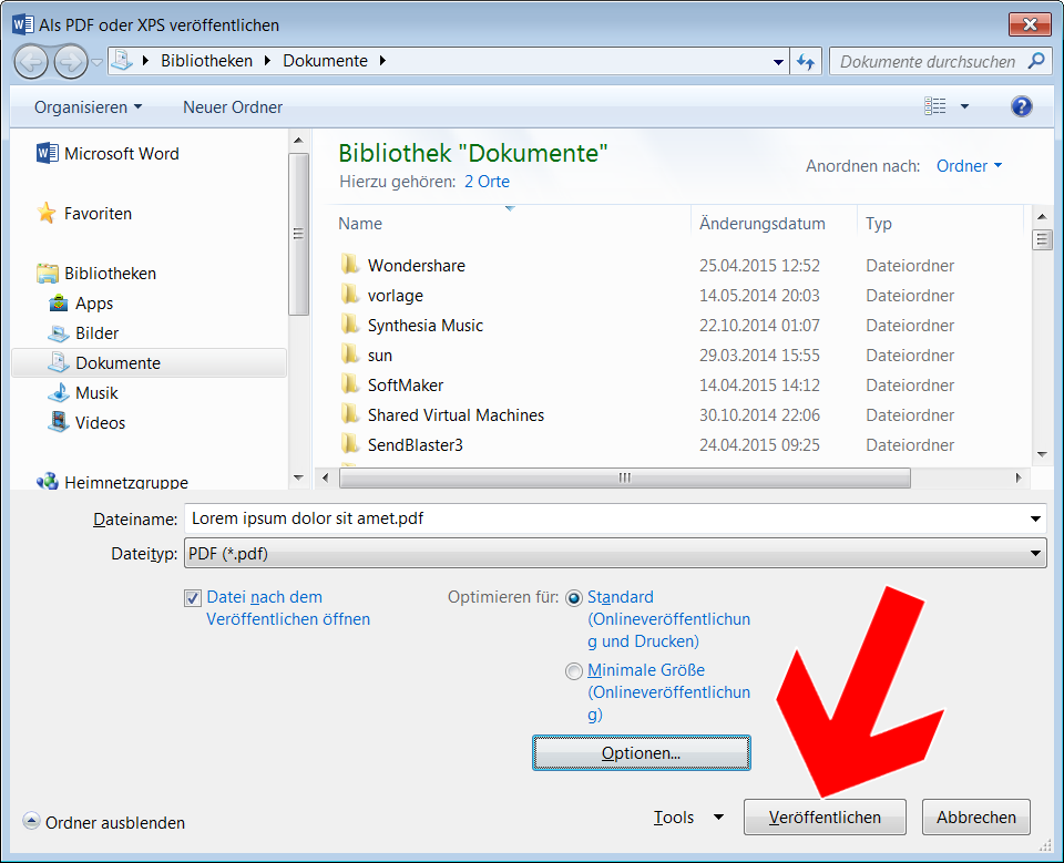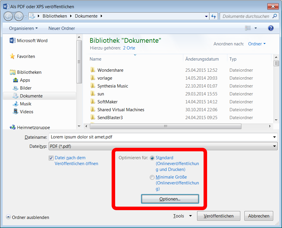 dem Klick auf Exportieren aktivieren Sie PDF/XPS-Dokument